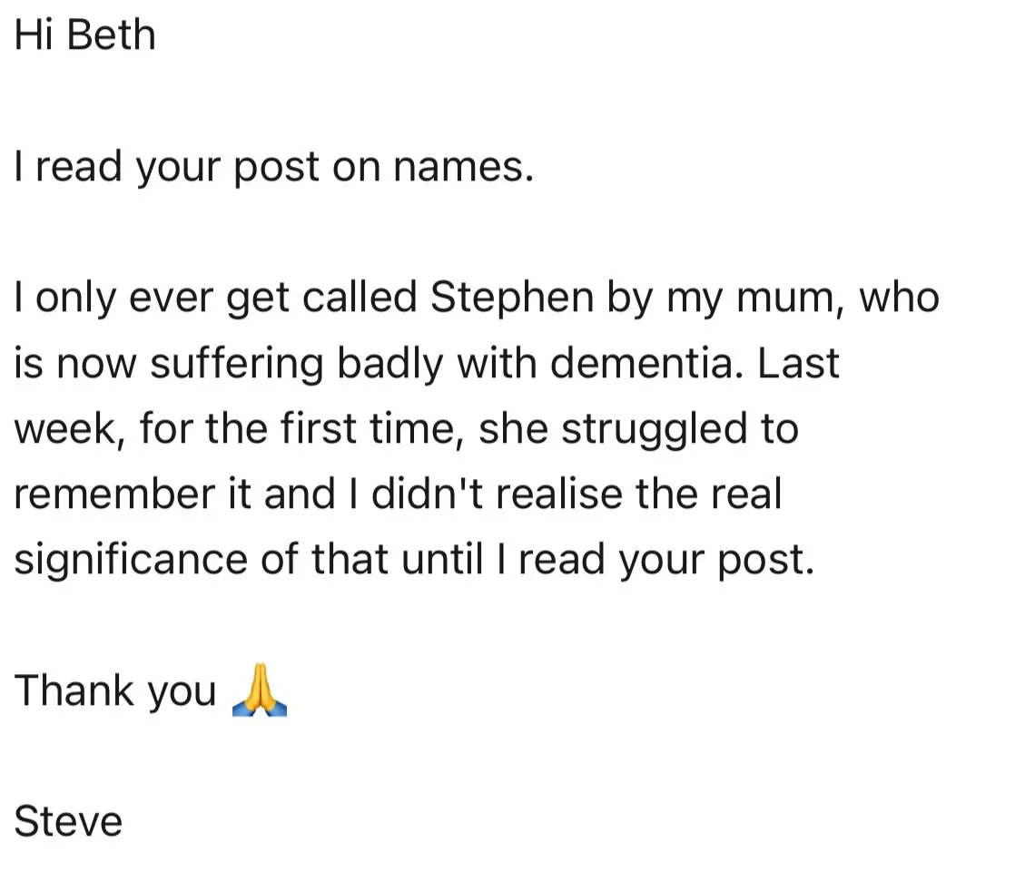 I’d like to leave you with one final thought about names. Among the lighthearted and humorous messages I received after making my post about names, one note was actually…touching.